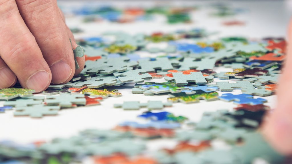 Im Pop-up-Space der Bibliothek (Lounge F Nord) wird gepuzzelt: Zu lösen ist ein Puzzle mit 500 Teilen, das einem Wimmelbild ähnelt.