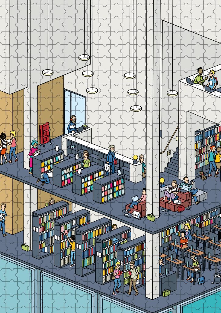 Im Mai legt die Bibliothek ein 500er-Puzzle im Pop-up-Space aus. Darauf abgebildet sind die Räumlichkeiten im Comicstil. Kommen Sie vorbei und machen Sie mit!