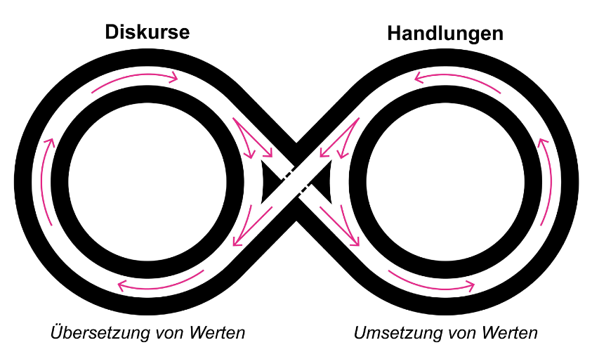 Solche diskursiven Prozesse werden im Modell des „Policy Enactment“ (Ball, Maguire & Braun, 2021) mit den Schritten „Übersetzung“ und „Umsetzung“ mit Handeln verbunden, welche manchmal mehrere Drehungen brauchen, und dienen als Orientierungsrahmen in der pädagogische Schulführung. Ausserdem ermöglichen sie das Sichtbarwerden von Werten.